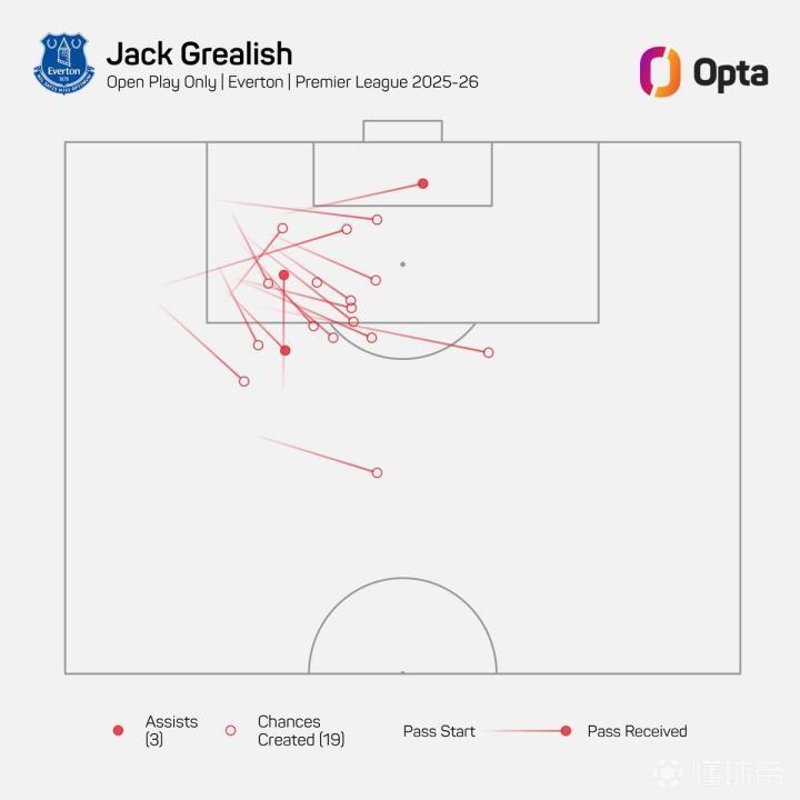 数据统计说了,这赛季格拉利什代表埃弗顿在英超踢了8场,运动战里一共创造了19次机会,现在英超里排第一呢。